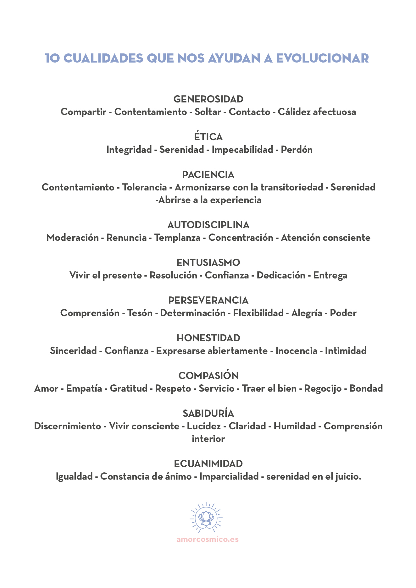 Selecciona una cualidad que te inspire. Arriba te he dejado un archivo con 10 cualidades que te pueden ayudar. Es conveniente realizar un trabajo previo de reflexión en torno a las consecuencias positivas de la cualidad. ¿Para qué sirve? ¿Qué papel tiene en mi propia vida? ¿Cuál es su lugar en el proceso vital? ¿Qué relevancia tiene en el camino espiritual? ¿Hacia dónde conduce tenerla? Necesitamos entender bien la cualidad. Estudiarla, conocer su significado y sentido. Incluso puedes inspirarte en personajes de la historia que han destacado por tener esa cualidad. Y elegir la lectura de biografías inspiradoras, documentales, etc.